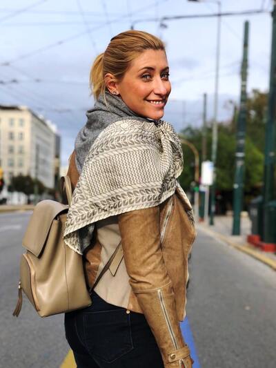 Η Σία Κοσιώνη αποφάσισε να λίγο τις ψηλοτάκουνες γόβες και τα στενά φορέματα του δελτίου ειδήσεων που παρουσιάζει και να φορέσει ένα σκουρόχρωμo blue jeans, καστόρινο καφέ jacket, μπεζ backpack και μεγάλο γκρι και μπεζ φουλάρι.