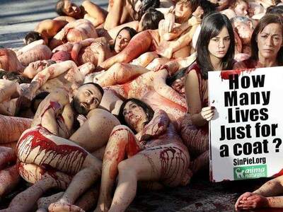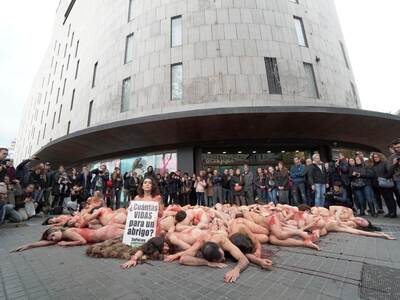 Δεκάδες άνθρωποι, γυμνοί και καλυμμένοι με ψεύτικο αίμα, ξάπλωσαν στην πλατεία Καταλονίας της Βαρκελώνης, διαμαρτυρόμενοι για τη χρήση γούνας και δέρματος από την παγκόσμια βιομηχανία ένδυσης και μόδας. Η διαμαρτυρία έγινε την Κυριακή από μέλη της οργάνωσης Anima Naturalis, που αγωνίζονται για τα δικαιώματα των ζώων στην Ισπανία και στην λατινική Αμερική.