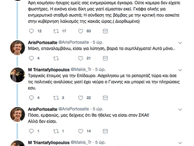 Αμέσως, ο Άρης Πορτοσάλτε απάντησε: «Μάκη, επαναλαμβάνω, είσαι για λύπηση, βαριά τα συμπλέγματα! Αυτό μόνο». Ο Μάκης Τριανταφυλλόπουλος επανήλθε γράφοντας: «Τραγικός έτοιμος για την Επίδαυρο. Ασχολήσου με το ρεπορτάζ τώρα και άσε τις πολιτικές αναλύσεις γιατί έχει νεύρα ο Γιάννης (σ.σ Αλαφούζος) και μπορεί να την πληρώσεις εσύ». «Πόσο, εμφανώς, μας δείχνεις ότι θα ήθελες να είσαι στον ΣΚΑΙ! Αλλά δεν είσαι», ανταπάντησε ο Άρης Πορτοσάλτε για να λάβει την απόκριση Τριανταφυλλόπουλου: «Σαν τρελός για να σε τρέχω όπως σου πρέπει».
