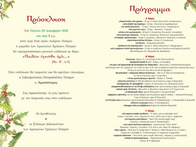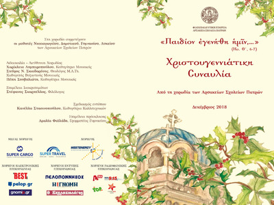 Εν όψει των εορτών των Χριστουγέννων και μετά την εξαιρετική επιτυχία των αντιστοίχων εκδηλώσεων των περασμένων ετών, τα Αρσάκεια Σχολεία Πατρών διοργανώνουν και εφέτος ανοικτή μεγάλη Συναυλία στον Ιερό Ναό τού Αγίου Ανδρέου Πατρών. Η συναυλία θα πραγματοποιηθεί στον νέο Ναό τού Πολιούχου, την ερχόμενη Πέμπτη 20 Δεκεμβρίου 2018 και ώρα 8 μ.μ., παρουσία τού Σεβασμιωτάτου Μητροπολίτου Πατρών κ. Χρυσοστόμου, ο οποίος και θα ομιλήσει επικαίρως. Θέμα τής εκδήλωσης είναι «Παιδίον εγενήθη ημίν» (Ησ. ΄Θ, 6).