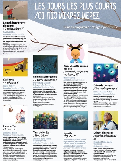 Οι «Πιο μικρές μέρες – Les jours les plus courts» είναι ένα πρόγραμμα με ταινίες μικρού μήκους για τους μικρότερους σε ηλικία φίλους του σινεμά, που όμως απευθύνεται σε όλη την οικογένεια καθώς είναι εξίσου απολαυστικό για μικρούς και μεγάλους . Παραδοσιακά, οι προβολές πραγματοποιούνται πριν και μετά την μικρότερη μέρα του χρόνου που σύμφωνα με το χειμερινό ηλιοστάσιο, είναι η 21η Δεκεμβρίου, και ορίζεται και ως η επίσημη έναρξη του χειμώνα!