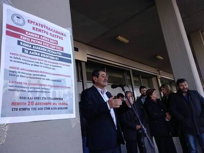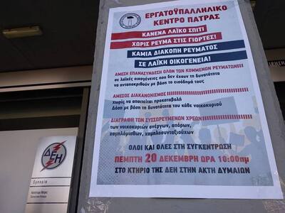 Δυναμική συγκέντρωση έξω από τη ΔΕΗ στην Ακτή Δυμαίων διοργάνωσε σήμερα στις 10 το πρωί το Εργατικο Κέντρο της Πάτρας με αίτημα «Κανένα λαϊκό σπίτι χωρίς ρεύμα στις γιορτές, καμία διακοπή ρεύματος σε λαϊκή οικογένεια».