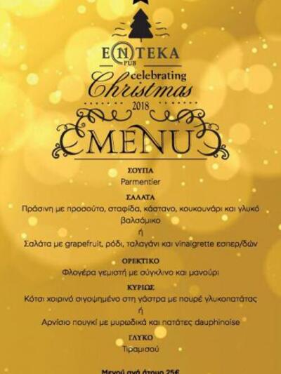 Σούπα γαλοπούλα, γαρίδες κοκτέιλ και ρολάκια σολωμού μαζί με σαλάτα Deck, ενώ για κυρίως πιάτα διαλέγετε ανάμεσα σε γαλοπούλα γεμιστή με κάστανα και κουκουνάρι και ψαρονέφρι με πουρέ κάστανο και σος δαμάσκηνων.