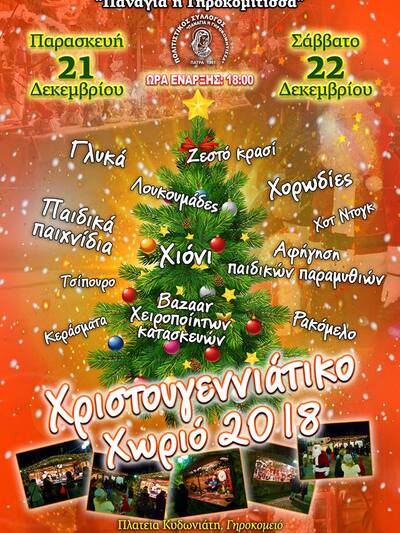 Ο Σύλλογος "Παναγία η Γηροκομίτισσα" για να γιορτάσει τα Χριστούγεννα, διοργανώνει εκδηλώσεις την Παρασκευή 21 Δεκεμβρίου και το Σάββατο 22 Δεκεμβρίου και καλεί όλους τους Πατρινούς να συμμετάσχουν.