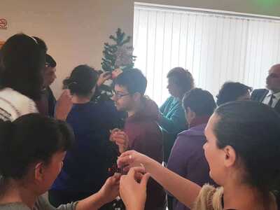 Γιορτινή ατμόσφαιρα δημιούργησαν δέκα παιδιά μέλη του Συλλόγου ΑμΕΑ Ναυπακτίας και Δωρίδας «Αλκυόνη» που στόλισαν σήμερα Παρασκευή 21 Δεκεμβρίου 2018 το χριστουγεννιάτικο δέντρο στην αίθουσα του Περιφερειακού Συμβουλίου. Τους συνόδευαν ο Διευθυντής των υποστηρικτικών δομών Γρηγόριος Παναγιωτόπουλος, η κοινωνική λειτουργός Σπυριδούλα Σιαμά και ο φυσιοθεραπευτής Άγγελος Αντωνόπουλος.