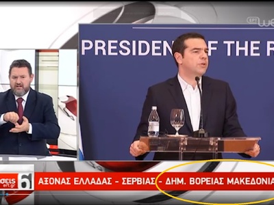 Πάντως, το απόγευμα της Παρασκευής η ΕΡΤ, στο δελτίο ειδήσεων των έξι, αποφάσισε να… αναγνωρίσει τη γειτονική χώρα με το νέο της όνομα και να αναγράψει στον τίτλο του θέματος για τη συνάντηση που είχε ο πρωθυπουργός Αλέξης Τσίπρας στο Βελιγράδι με τον Σέρβο ομόλογό του, τη ΠΓΔΜ ως «ΔΗΜ. ΒΟΡΕΙΑΣ ΜΑΚΕΔΟΝΙΑΣ», όπως φαίνεται και στη φωτογραφία. Ο επίμαχος τίτλος εμφανίστηκε για λίγα δευτερόλεπτα και στη συνέχεια αντικαταστάθηκε.