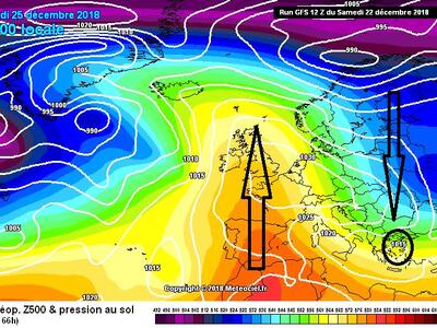 Πιο συγκεκριμένα, η ανατολική-βορειοανατολική επέκταση του Αζορικού αντικυκλώνα προς την δυτική=βορειοδυτική και κεντρική Ευρώπη σε συνδυασμό με την ταυτόχρονη ενίσχυση τπν πολικού αεροχείμαρρου (jet stream) σε άξονα βορρά-νότου θα έχει σαν αποτέλεσμα την κάθοδο κρύων αερίων μαζών προς την ανατολική Ευρώπη και κατ' επέκταση και στην ευρύτερη περιοχή των Βαλκανίων συμπεριλαμβανομένης και της χώρας μας προκαλώντας αισθητότατη πτώση της θερμοκρασίας ανήμερα των Χριστουγέννων από βορρά προς νότο. Η πτώση αυτή θα συνδυαστεί και με ένα αβαθές βαρομετρικό χαμηλό στην τροπόσφαιρα άνωθέν μας και έτσι φαινόμενα θα απασχολήσουν το μεγαλύτερο τμήμα της Ελλάδας.
