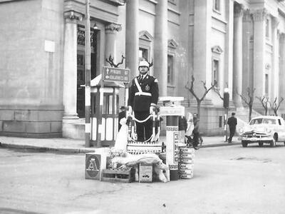 Γούναρη και Κορίνθου ‘60ς (αρχείο Γιάννη Μυλωνά)-Ο τροχονόμος πάντα στη θέση του έξω από τα δικαστήρια, με δώρα κάτω από τη βάση που στέκεται για να ρυθμίζει την κυκλοφορία.