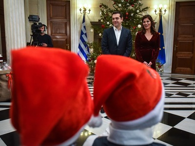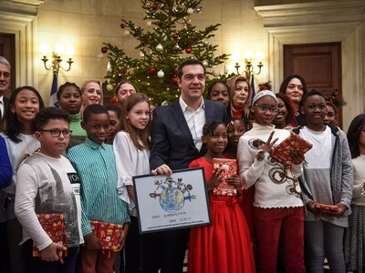 Λίγο μετά τις 11, απέναντι από το χριστουγεννιάτικο δέντρο του Μεγάρου Μαξίμου, απέναντι από τον πρωθυπουργό και τη σύντροφό του, πήραν τη θέση τους τα παιδιά του Δημοτικού σχολείου Διαπολιτισμικής Εκπαίδευσης Αλσούπολης.