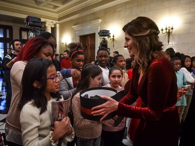 Την παράσταση έκλεψε το μικρό κοριτσάκι εργαζομένου στο Μέγαρο Μαξίμου, που φορώντας το κόκκινο, αγιοβασιλιάτικο σκουφί της, στεκόταν σοβαρό και ήρεμο μπροστά στην κ. Μπαζιάνα, όσο τα μεγαλύτερα παιδιά τραγουδούσαν.