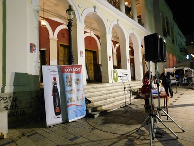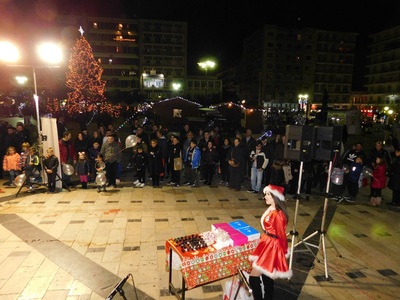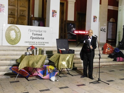 Μπροστά στο Δημοτικό Θέατρο η παράσταση του Ταχυδακτυλουργού μας ενθουσίασε, οι μικροί μας φίλοι πήραν μπαλόνια από τον Άγιο Βασίλη και την βοηθό του, και όλοι κεράστηκαν με τα παραδοσιακά γλύκα και ποτά προσφορά καταστημάτων.