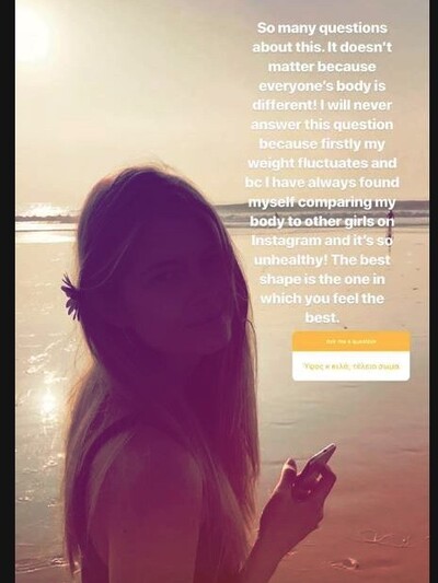 «Έχω λάβει τόσες ερωτήσεις σχετικά με τα κιλά. Δεν έχει σημασία πόσα κιλά είμαι γιατί κάθε σώμα είναι διαφορετικό! Δεν θα απαντήσω ποτέ σ’ αυτή την ερώτηση γιατί έχω παρατηρήσει πολλές φορές και τον ίδιο μου τον εαυτό, να μπαίνει σε διαδικασία σύγκρισης με άλλες κοπέλες στο Instagram κι αυτό είναι ανθυγιεινό! Το καλύτερο βάρος είναι αυτό στο οποίο ο καθένας αισθάνεται καλύτερα!»