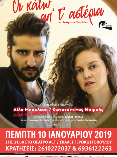 Μετά λοιπόν τα συνεχόμενα sold out σε Αθήνα και Θεσσαλονίκη και την πολύ επιτυχημένη περιοδεία σε όλη την Ελλάδα, και λίγο πριν τις παραστάσεις του σε Λονδίνο, Μάντσεστερ και Άμστερνταμ τον Μάρτιο, το θεατρικό έργο του Τηλέμαχου Τσαρδάκα «Οι κάτω απ’ τ' αστέρια» επιστρέφει μόνο για μια παράσταση την Πέμπτη 10/1/2019 στις 21.00 στο act. Ερμηνεύουν οι αγαπημένοι ηθοποιοί Λίλα Μπακλέση και Κωνσταντίνος Μπιμπής οι οποίοι υπογράφουν και τη σκηνοθεσία σε συνεργασία με την Άρτεμη Γρύμπλα.