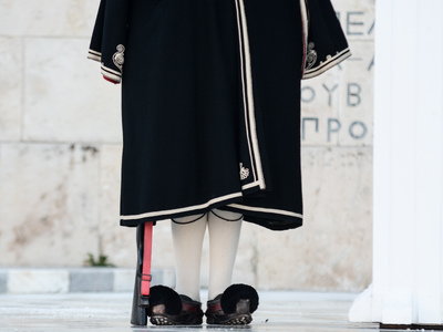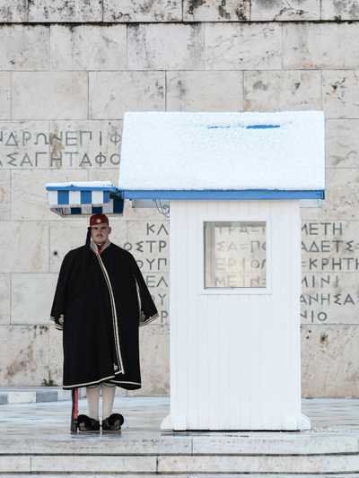 Να μένει ακίνητος, αγέρωχος και με το βλέμμα στο άπειρο ακόμα και όταν χιονίζει, είναι η (σκληρή) μοίρα του Εύζωνα.