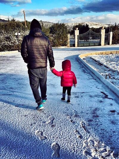 Ο Γιάννης Βαρδής με την κόρη του περπατούν στους στρωμένους από χιόνι δρόμους.