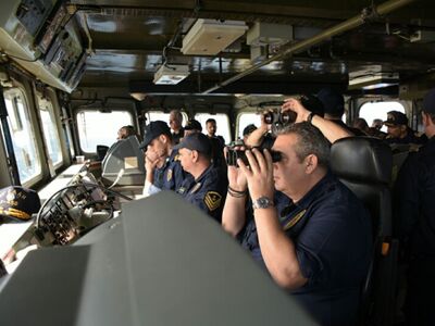 Στην παραπάνω φωτογραφία χρησιμοποιεί κιάλια προκειμένου να δει μέσα από μία φρεγάτα.