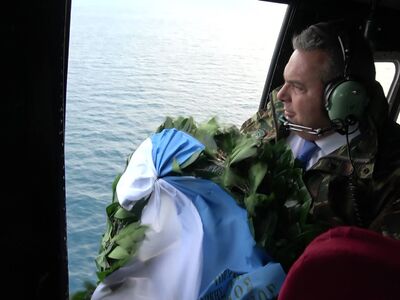 Τη συμβολική αυτή κίνηση γνωστοποίησε ο ίδιος σε ανάρτησή του στο Twitter, την οποία μάλιστα συνόδευσε με σχετική φωτογραφία, στην οποία εμφανίζεται να πετά στεφάνι στη μνήμη των τριών πεσόντων (Καραθανάση, Βλαχάκου, Γιαλοψού) των Ιμίων.