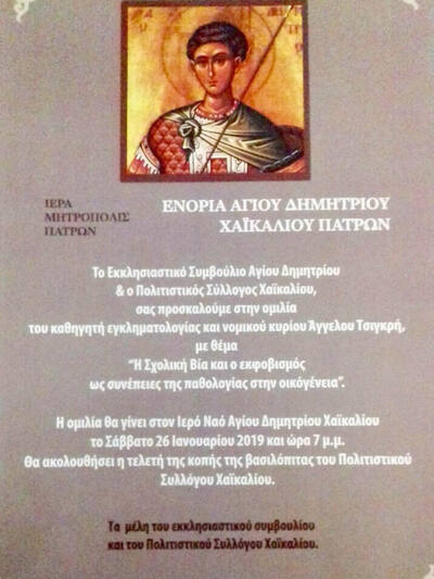 Ο δικηγόρος και καθηγητής της Εγκληματολογίας (τ. γενικός γραμματέας του Υπουργείου Δικαιοσύνης) Άγγελος Τσιγκρής που έχει ερευνήσει σε βάθος και αναδείξει το πρόβλημα της σχολικής βίας στη χώρα μας, θα μιλήσει αυτό το Σάββατο 26 Ιανουαρίου 2019 στις 19.00, στο Χαϊκάλι Πατρών (Ιερός Ναός Αγίου Δημητρίου), με θέμα: “Η σχολική βία και ο εκφοβισμός ως συνέπειες της παθολογίας στην οικογένεια”.