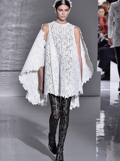 Η 17χρονη νέα fashion princess Κάια Γκέρμπερ με ένα υπέροχο λευκό δαντελένιο μίνι φόρεμα και μαύρες ψηλές μπότες από την ίδια δαντέλα σε μαύρο, ήταν η κορυφαία φιγούρα στο Givenchy Couture Show στο Παρίσι, που κατά την άποψή μας ήταν μακράν το ωραιότερο όλων. Η Clare Waight Keller εκσυγχρόνισε τη βραδινή ένδυση, δίχως να της στερήσει το ρομαντισμό της. Όπως δήλωσε προσέγγισε την υψηλή ραπτική όσο το δυνατόν πιο μοντέρνα…