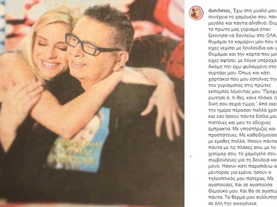 «ΠΑΝΤΑ διπλά σου είχα αυτό το χαμόγελο… Ότι «ΟΛΑ» θα πήγαιναν καλά… εσύ μου έμαθες να πατάω με σιγουριά κ να έχω πάντα το θάρρος της γνώμης μου… Ήσουν και θα είσαι ένα απ τα σημαντικότερα κεφάλαια της ζωής μου! Ο μέντορας μου,ο φίλος μου, ο συνεργάτης κ άνθρωπος δικός μου!! Σ’ ευχαριστώ για «ΟΛΑ»! Εύχομαι να ξεκουραστεί τώρα η ψυχή σου! Καλό ταξίδι αγαπημένε μου… Τα συλλυπητήρια μου στην οικογένεια σου…».