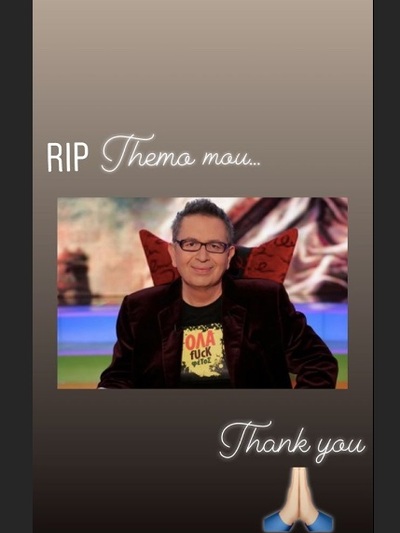 «Απέραντη θλίψη. Έχω μόνο αγάπη, σεβασμό και θαυμασμό για αυτόν τον ευαίσθητο, προστατευτικό και ευφυή άνθρωπο. Σε ευχαριστώ Θέμο μου που μπόρεσα να υπάρξω το «κορίτσι» σου, να δω και να μάθω τόσα από εσένα. Καλό Παράδεισο να έχεις, αφήνεις ένα μεγάλο κενό. Τα συλλυπητήρια μου από τα βάθη της καρδιάς μου στην οικογένεια, στους φίλους και στους συνεργάτες. Μία μέρα ο πόνος θα απαλυνθεί. Σε ευχαριστούμε για «Όλα»».