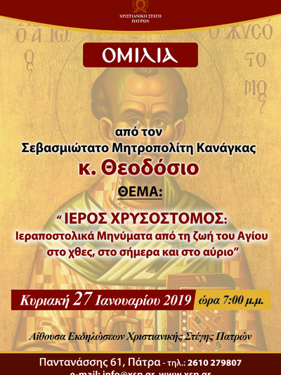 Ομιλία θα πραγματοποιήσει ο σεβασμιότατος Μητροπολίτης Κανάγκας κ. Θεοδόσιος με θέμα "Ιερός Χρυσόστομος: Ιεραποστολικά Μηνύματα από τη ζωή του Αγίου στο χθες, στο σήμερα και στο αύριο" αυτή την Κυριακή 27 Ιανουαρίου 2019 στις 19.00 το απόγευμα στην κεντρική αίθουσα εκδηλώσεων της Χριστιανικής Στέγης Πατρών, στην οδό Παντανάσσης.