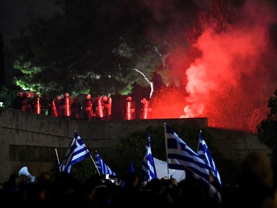 22:20 Επίθεση με φωτοβολίδες προς τους άνδρες των ΜΑΤ, στο πλάι της Βουλής, στη συγκέντρωση κατά της συμφωνίας των Πρεσπών.
