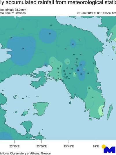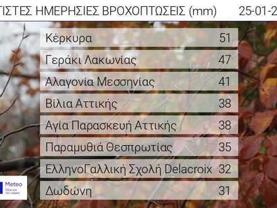 Στον πίνακα που ακολουθεί (Πίνακας 1) παρουσιάζονται οι σταθμοί του Εθνικού Αστεροσκοπείου/meteo.gr που κατέγραψαν τα 8 μεγαλύτερα ύψη βροχής έως το πρωί της Παρασκευής 25/01.