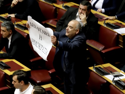 Πανό στη Βουλή, στη ψηφοφορία για τη Συμφωνία των Πρεσπών, σήκωσε ο βουλευτής της Ένωσης Κεντρώων, με το σύνθημα «Δεν φταίει η Δημοκρατία». Με τον τρόπο αυτό ο βουλευτής θέλησε να υπογραμμίσει το «όχι» του στην ψηφοφορία, αλλά και να δώσει απάντηση σε όσους ακραίους ισχυρίζονται πως «η Δημοκρατία πούλησε τη Μακεδονία».