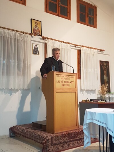 Στη συνέχεια έγινε χαιρετισμός και απολογισμός των δράσεων της Ε.ΡΩ. Πατρών από μέλη του σωματείου και ακολούθησε ομιλία του πρωτοπρεσβύτερου π. Ευάγγελου Πριγκιπάκη, προϊσταμένου του Ι.Ν. Αγίων Αποστόλων Πατρών, με θέμα «Η αξία του χρόνου για τη Σωτηρία του ανθρώπου, σύμφωνα με τον Μέγα Βασίλειο».