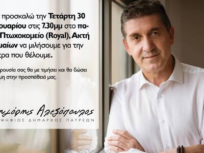 "Σας περιμένω την Τετάρτη το απόγευμα να μιλήσουμε για την Πάτρα μας, σε μια ανοιχτή εκδήλωση για όλους", αναφέρει στην πρόσκληση. Η ομιλία θα αποδίδεται και στη νοηματική γλώσσα.