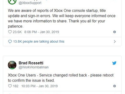 Την Τετάρτη, η Microsoft έκανε tweet πως έχει γνώση του προβλήματος που αφορούσε στην "εκκίνηση της κονσόλας Xbox One, την ενημέρωση τίτλου και τα λάθη σύνδεσης" και δήλωσε ότι θα δώσει ενημερώσεις.