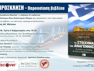 Το βιβλιοπωλείο Discover, οι εκδόσεις S+(αισθeτικό), και ο Σύλλογος Νέων Καλλιτεχνών Πατρών σας προσκαλούν στην παρουσίαση του νέου βιβλίου του πολιτικού επιστήμονα- διεθνολόγου, Ιωάννη Αθ. Μήτσιου με τίτλο: Το στοίχημα της Αναγέννησης- Το μέλλον της Ελλάδας σε έναν μεταβαλλόμενο κόσμο.