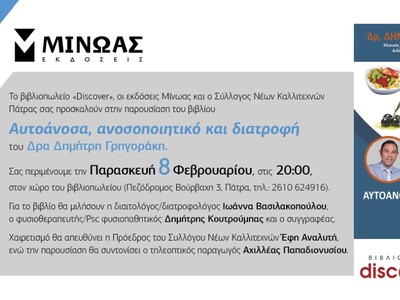Το βιβλιοπωλείο Discover, Οι εκδόσεις "Μίνωας" και ο Σύλλογος Νέων Καλλιτεχνών Πάτρας σας προσκαλούν στην παρουσίαση του Δρα Δημήτρη Γρηγοράκη με τίτλο: "Αυτοάνοσα, ανοσοποιητικό και διατροφή". Η εκδήλωση θα πραγματοποιηθεί την Παρασκευή 8 Φεβρουαρίου στις 20:00, στον χώρο του βιβλιοπωλείου, πεζόδρομος Βούρβαχη 3.