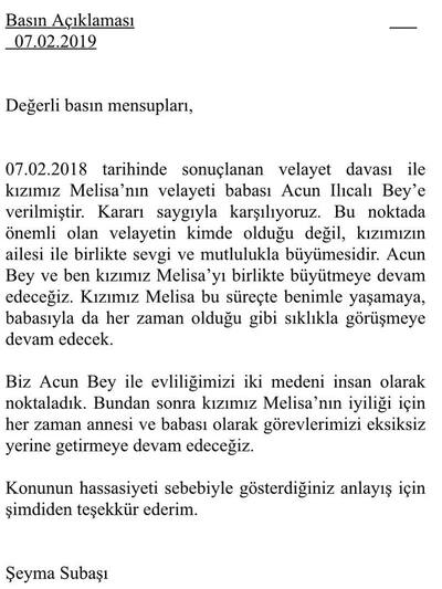 Η ανακοίνωση της Seyma Subasi ανέφερε μεταξύ άλλων πως η κηδεμονία της Melisa δόθηκε στον πατέρα της και πως το σημαντικό είναι η κόρη τους να μεγαλώσει ευτυχισμένη και με αγάπη. Οι δυο τους συνέχισε στην ανακοίνωσή της χώρισαν σαν δύο πολιτισμένοι άνθρωποι και για χάρη της μικρής θα συνεχίζουν να διατηρούν άριστες σχέσεις. Στη συνέχεια ζήτησε από τα μέσα ενημέρωσης να σεβαστούν και να κατανοήσουν αυτή τη κατάσταση.