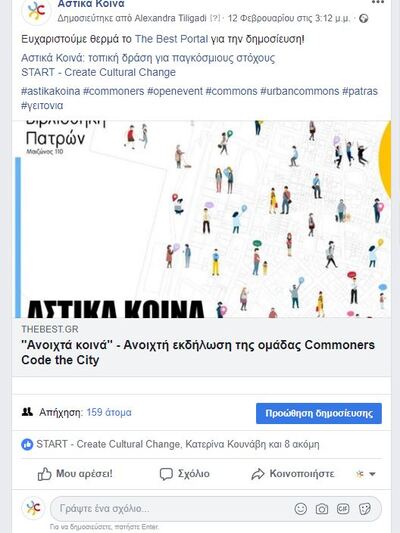 *To πρόγραμμα "Αστικά Κοινά" από την ομάδα Commoners code the city είναι ένα αστικό παιχνίδι συμμετοχικού σχεδιασμού που θα πραγματοποιηθεί στην Πάτρα βασισμένο στην πεποίθηση πως πρέπει να δώσουμε λόγο στους ανθρώπους για την αστική ανάπτυξη του περιβάλλοντος που ζούνε. Μέσα από την αφήγηση ιστοριών για τη γειτονιά, τη μεθοδολογία του συμμετοχικού σχεδιασμού, και φυσικά το παιχνίδι θα σχηματιστεί από τους πολίτες ο άυλος και υλικός τόπος, θα ξανά γίνουν πάλι γείτονες που γνωρίζονται και μοιράζονται κάτι κοινό, τη γειτονιά.