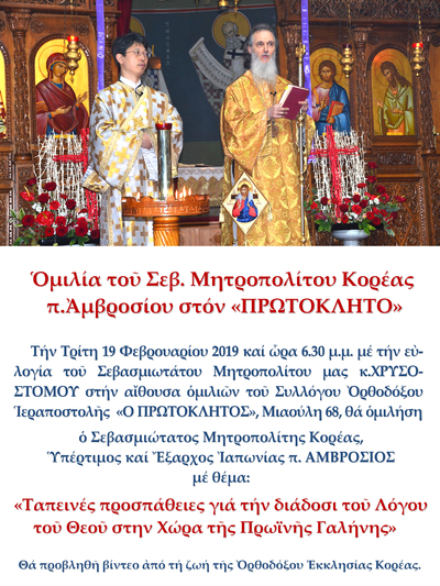Την ερχόμενη Τρίτη 19 Φεβρουαρίου 2019 ε.ε. με την ευλογία του σεβασμιοτάτου Μητροπολίτου Πατρών κ. Χρυσοστόμου θα έρθει στην πόλη της Πάτρας, ο σεβασμιότατος Μητροπολίτης Κορέας και Υπέρτιμος Έξαρχος Ιαπωνίας π. Αμβρόσιος για να μιλήσει στην αίθουσα εκδηλώσεων του Συλλόγου Ορθοδόξου Ιεραποστολής «Ο Πρωτόκλητος», στην οδό Μιαούλη 68 και Κανακάρη, στις 18.30 το απόγευμα.