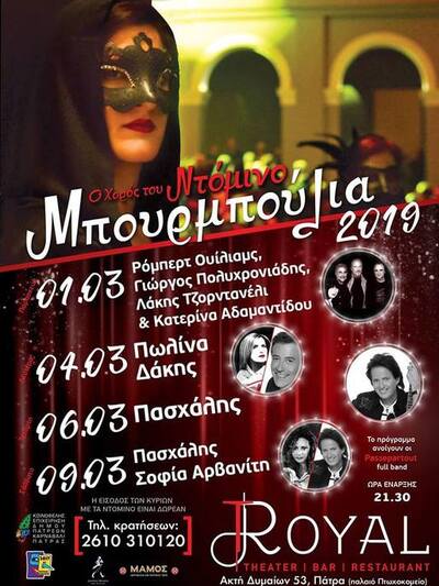 Τα Μπουρμπούλια θα φιλοξενηθούν στον άνετο χώρο του Royal – παλιού Πτωχοκομείου, στην Ακτή Δυμαίων ενώ όπως προείπαμε απαραίτητο για την δωρεάν είσοδο των κυριών είναι φορούν το μαύρο ντόμινο.