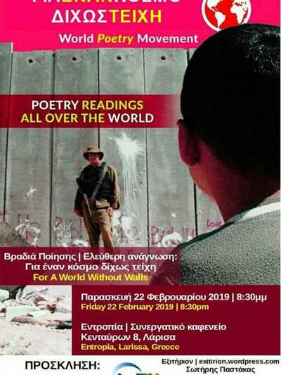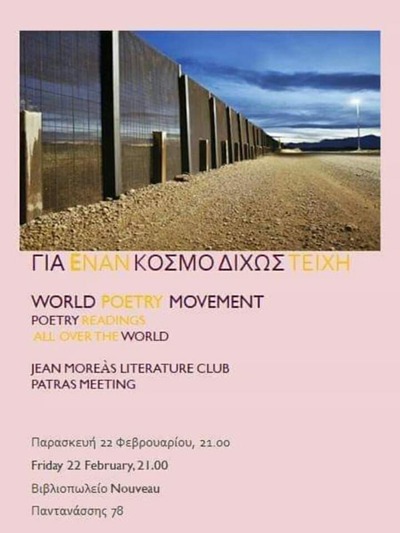 Το Γραφείο Ποιήσεως σε συνεργασία με το βιβλιοπωλείο Nouveau και τη λέσχη Ανάγνωσης Ποίησης "Jean Moreas" διοργανώνουν την Ποιητική συνάντηση "Ένας Κόσμος Χωρίς Τείχη" στην Πάτρα την Παρασκευή 22 Φεβρουαρίου στο χώρο του βιβλιοπωλείου Nouveau στις 21.00 . Το Γραφείο Ποιήσεως μετά την επικοινωνία με τον ποιητή Fernado Rondon που έχει την ευθύνη αυτής της παγκόσμιας διοργάνωσης συνομιλεί με αυτή την διοργάνωση που γίνεται σε ταυτόχρονα τον Φεβρουάριο σε 150 χώρες με 500 ποιητικές εκδηλώσεις.