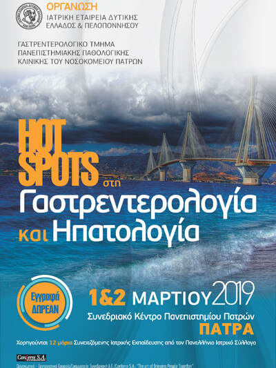 Το Γαστρεντερολογικό Τμήμα της Πανεπιστημιακής Παθολογικής Κλινικής του Πανεπιστημιακού Νοσοκομείου Πατρών και η Ιατρική Εταιρεία Δυτικής Ελλάδας και Πελοποννήσου διοργανώνουν Διημερίδα με θέμα: «Hot Spots στη Γαστρεντερολογία και Ηπατολογία», η οποία θα πραγματοποιηθεί την Παρασκευή 1η και το Σάββατο 2 Μαρτίου 2019 στο Συνεδριακό και Πολιτιστικό Κέντρο του Πανεπιστημίου Πατρών, στο Ρίο.