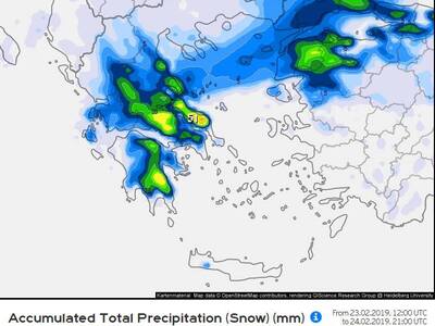 Στον χάρτη που σας επισυνάπτω, φαίνονται ξεκάθαρα οι περιοχές που θα εκδηλώνονται χιονοπτώσεις κατά τη διάρκεια της Κυριακής. Όπως χαρακτηριστικά βλέπετε, θα επηρεάζονται τμήματα από τη Θεσσαλία και νοτιότερα έως και την Πελοπόννησο περίπου από τα 350-400 μέτρα και υψηλότερα. Μάλιστα, στη Θεσσαλία αλλά και στην κεντρική Στερεά τα υψόμετρα χιονόπτωσης θα είναι ακόμη πιο χαμηλά. Περίπου στις ίδιες περιοχές (αλλά και από τα ίδια υψόμετρα) θα διατηρηθούν οι χιονοπτώσεις και τη Δευτέρα με τη μόνη διαφορά ότι θα χιονίσει πρόσκαιρα στη Μακεδονία και τη Θράκη ακόμη και τμήματα πολύ χαμηλού υψομέτρου. Βέβαια τα φαινόμενα της Δευτέρας θα είναι πιο εξασθενημένα.