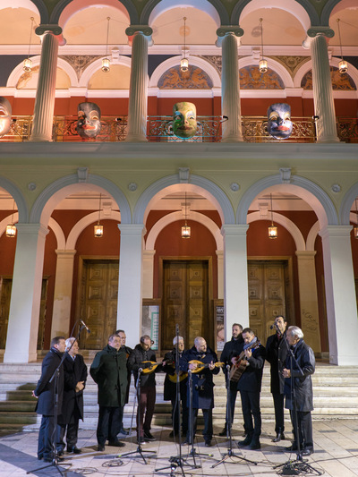 Aψηφώντας τους ισχυρούς αέρηδες και τις χαμηλές θερμοκρασίες, οι Τραγουδιστάδες τση Ζάκυνθος με φόντο το φωταγωγημένο κόσμημα του Τσίλλερ, το Δημοτικό Θέατρο έδωσαν συναυλία μεταφέροντάς μας σε άλλες εποχές όπου οι καντάδες και τα ευγενικά ήθη είχαν τον πρώτο λόγο στις ζωές και στους έρωτες των ανθρώπων.