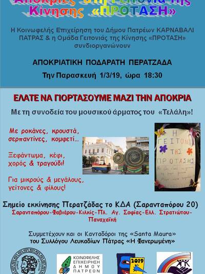 Αποκριάτικη ποδαράτη περατζάδα διοργανώνουν την Παρασκευή 1 Μαρτίου στις 18.30 η Κοινωφελής Επιχείρηση του Δήμου Πατρέων «Καρναβάλι Πάτρας» και η Ομάδα Γειτονιάς της Κίνησης «Πρόταση».