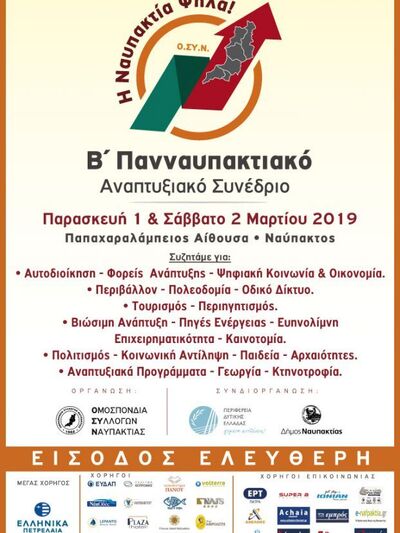 Το Β΄ Πανναυπακτιακό Αναπτυξιακό Συνέδριο θα πραγματοποιηθεί την Παρασκευή 1 και το Σάββατο 2 Μαρτίου 2019 στην Παπαχαραλάμπειο Αίθουσα της Ναυπάκτου. Διοργανώνεται από την Ομοσπονδία των Συλλόγων της Ναυπακτίας με συνδιοργανωτές την Περιφέρεια Δυτικής Ελλάδας και το Δήμο Ναυπακτίας. Για το περιεχόμενο και τους στόχους του δόθηκε συνέντευξη Τύπου το Σάββατο 23 Φεβρουαρίου 2019, στην αίθουσα Δημοτικού Συμβουλίου στο Ξενία.