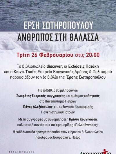 Η Πατρινής καταγωγής βραβευμένη συγγραφέας Έρση Σωτηροπούλου θα βρεθεί στη γενέτειρα της για να παρουσιάσει το νέο της βιβλίο. Πιο συγκεκριμένα το βιβλιοπωλείο Discover, οι εκδόσεις Πατάκη και η Εταιρεία Κοινωνικής δράσης και Πολιτισμού Κοινο_Τοπία (www.koinotopia.gr), συνδιοργανώνουν εκδήλωση παρουσίασης του νέου βιβλίου της Έρσης Σωτηροπούλου με τίτλο «Άνθρωπος στη θάλασσα».