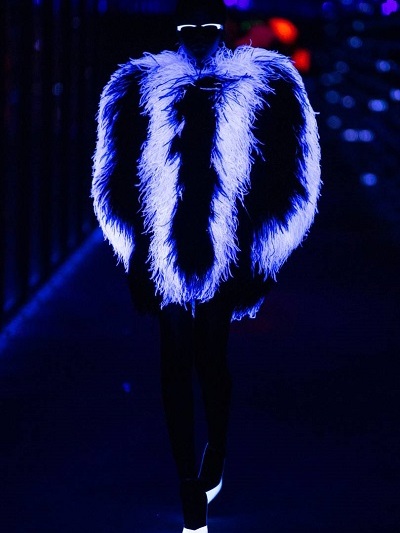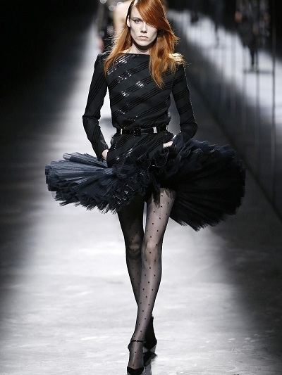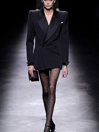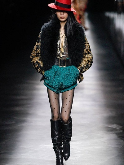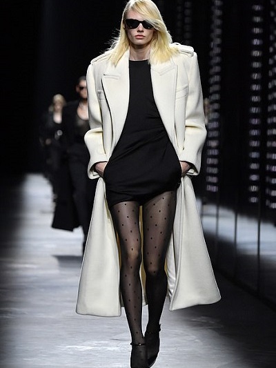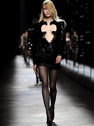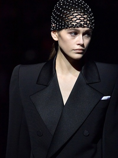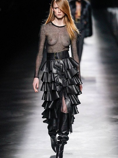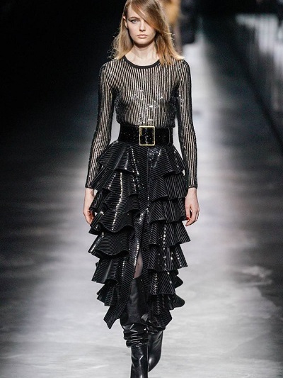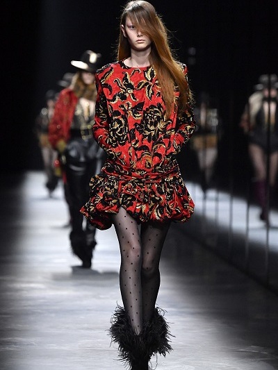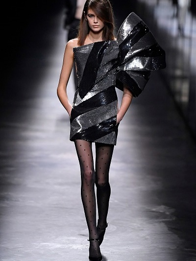 Στο Saint Laurent η εποχή των sexy eighties παραμένει με τους ώμους σε παλτό και σακάκια να είναι πιο πελώριοι από ποτέ. Ο creative director Αntony Vaccarello εμπνεύστηκε από τις παλιές μούσες του αξέχαστου Yves Μπέτι Κατρού και Κατρίν Ντενέβ για να πλάσει μια ακόμα πιο δυναμική εικόνα για τις γυναίκες. Είδαμε πολλά μεταλιζέ, μαύρα δερμάτινα, πολλά «καυτά» μίνι, αλλά και μίντι και μάξι φούστες, σορτσάκια ακόμα και φλούο γουναρικά στο σκοτάδι. Στο ντεφιλέ του η 17χρονη πριγκίπισσα της πασαρέλας Κάια Γκέρμπερ έλαμψε ξανά.