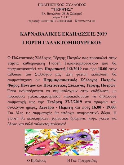 Ο Πολιτιστικός Σύλλογος Τέρψης Πατρών σας προσκαλεί στην ετήσια καθιερωμένη Γιορτή Γαλακτομπούρεκου που θα πραγματοποιηθεί την Παρασκευή 1/3/2019 και ώρα 18.00 στην αίθουσα του Συλλόγου (Ελ. Βενιζέλου 38 και Σολωμού).