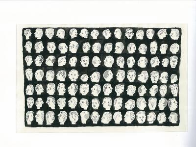 Τα ασπρόμαυρα: Ψάρια, πουλιά, σπίτια και ανθρώπινες κεφαλές, από ακουαρέλα και μελάνι, σε μια παραλληλόγραμμη ευταξία, με φόντο σκούρο ή άνευ τούτου, ορίζουν με την πολλαπλότητά τους και την παραλλαγμένη επαναληπτικότητά τους τα όρια και το περιεχόμενο του πίνακα. Η επανάληψη, η ρεαλιστική γραφή των «αντικειμένων», η μικροσκοπική τους αποτύπωση μοιάζουν να συμβάλλουν στην καταγραφή ενός μυστικού κώδικα. Μνείες μεσαιωνικές μικρογραφιών, τελετουργίες και ξόρκια αναβιώνουν σε μια ιδεογραφική αντιμετώπιση του κόσμου, παρά τον απτό και ρεαλιστικό χαρακτήρα της θεματικής.