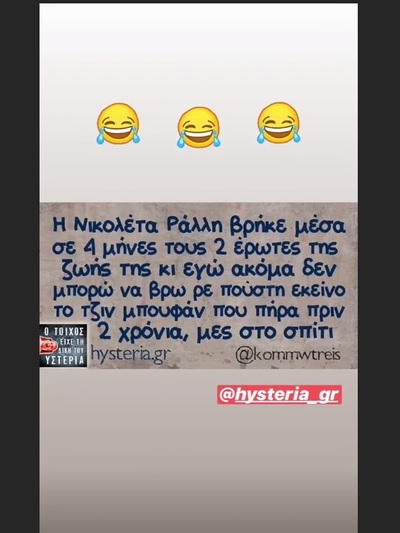 Συγκεκριμένα, δημοσίευσε μια εικόνα από το hysteria.gr που έγραφε: «Η Νικολέττα Ράλλη βρήκε μέσα σε 4 μήνες τους δύο έρωτες της ζωής της και εγώ ακόμη δε μπορώ να βρω ρε π@$στη μου εκείνο το τζιν μπουφάν που πήρα πριν 2 χρόνια, μέσα στο σπίτι». Μάλιστα, το σχολίασε παραθέτοντας emoji που κλαίνε από τα γέλια.