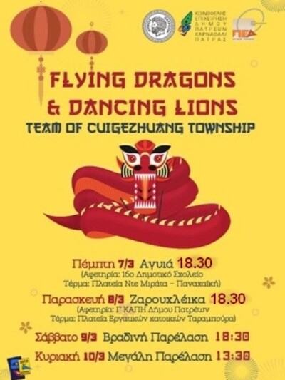 Ο εκλεκτός κινέζικος θίασος Flying Dragons and Dancing Lions Team of Cuigezhuang Township, θα βρίσκεται από σήμερα στην Πάτρα και θα συμμετέχει στο Καρναβάλι, στο πλαίσιο των πολιτιστικών ανταλλαγών που έχει ξεκινήσει η Δημοτική Αρχή με πόλεις της Λαϊκής Δημοκρατίας της Κίνας.